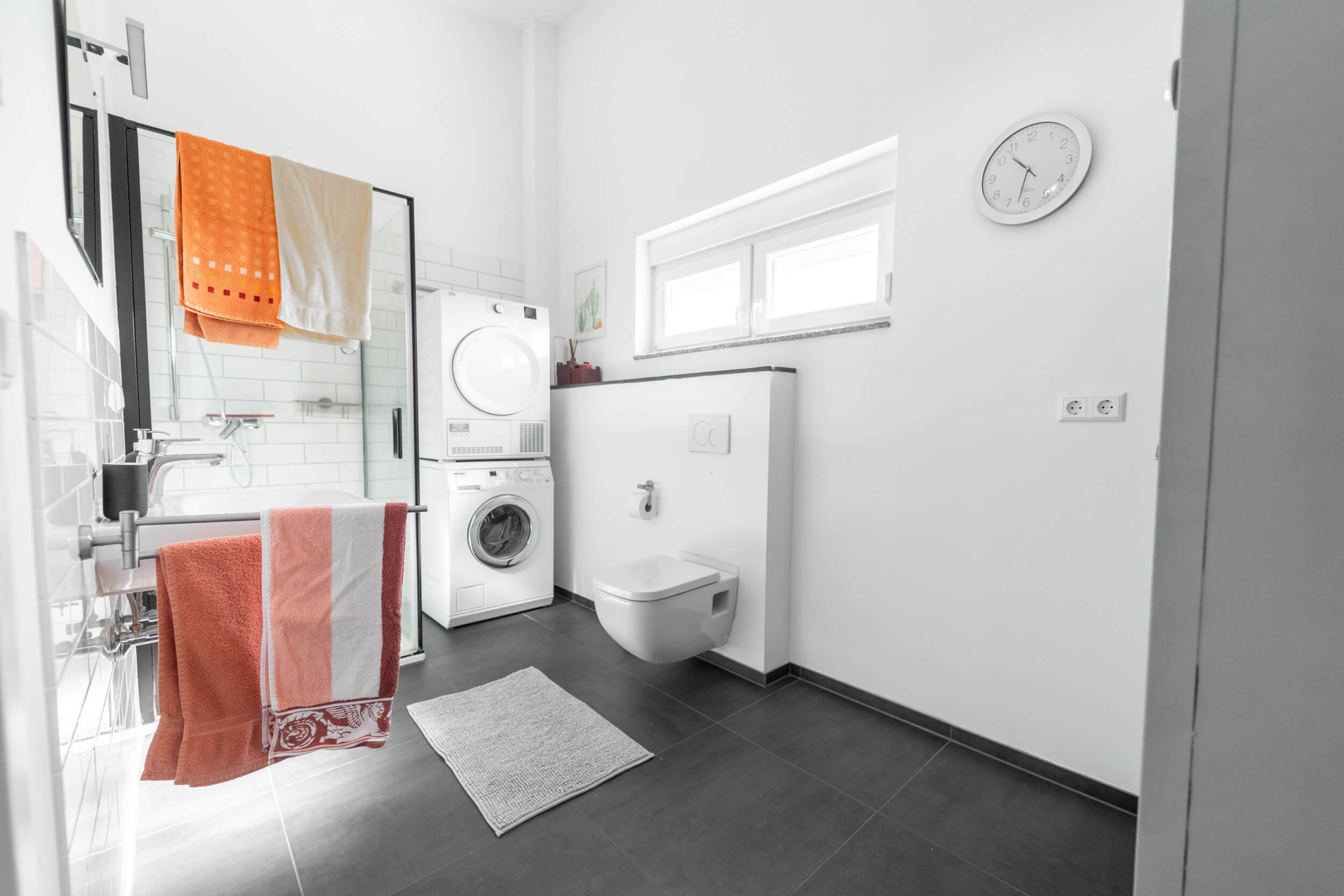 Das großzügige Badezimmer ist zusätzlich mit einer Glasdusche, einer Waschmaschine und einem Trockner ausgestattet. Tageslicht rundet das helle Bad ab.