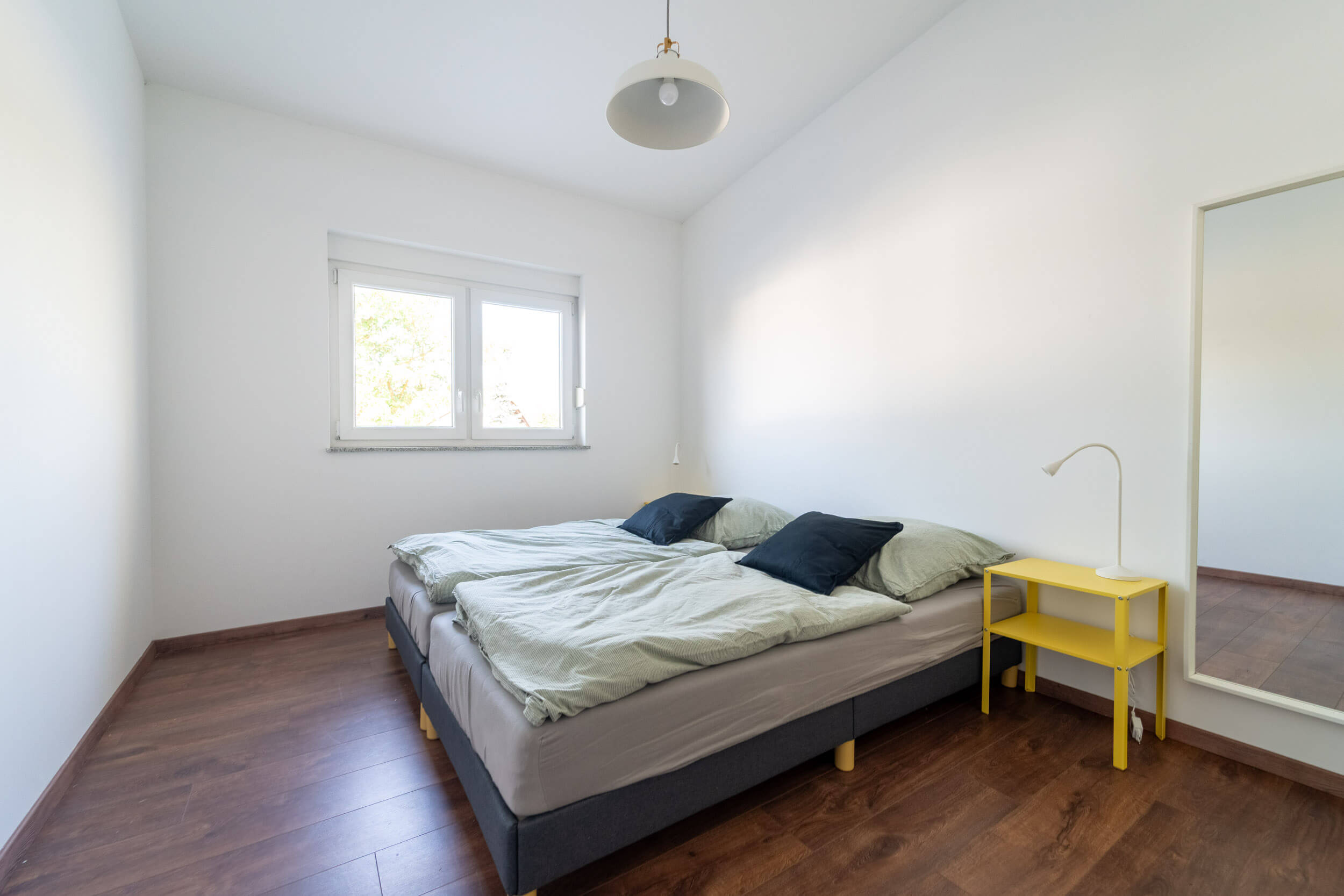 Im Schlafzimmer 2 beinhaltet zwei Betten, einen Spiegel und eine Kommode. Die hohen Decken geben ein schönes Raumgefühl.